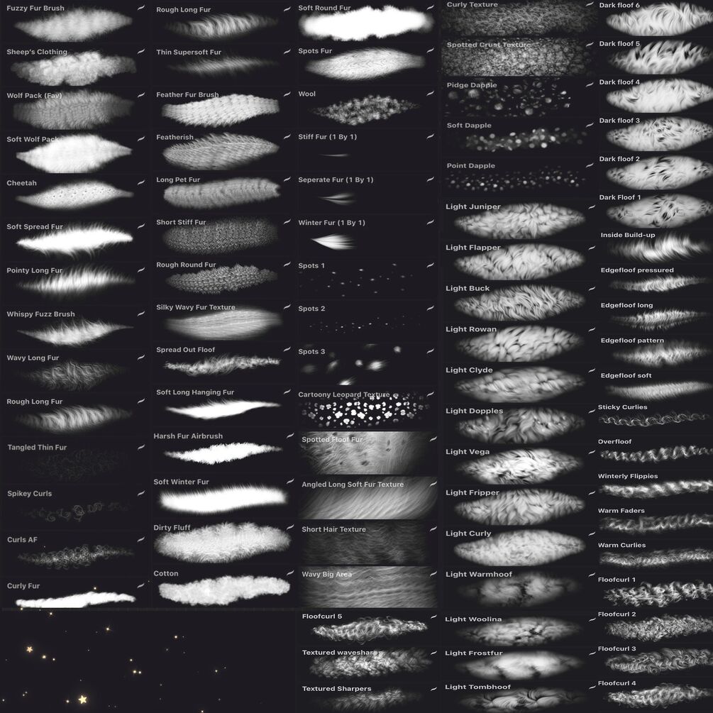 Realistic looking fur brushes which I use in my own personal work! I made these brushes to replicate my exact hair/fur techique I do in my drawings. Lots to choose from and different animal textures.
